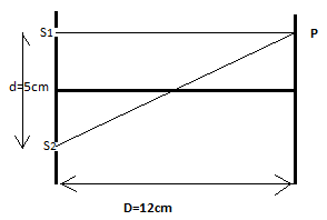 The path travelled by light from slit \[{S_2}\]to \[{S_2}P\]\[ = \sqrt {{D^2} + {d^2}} = \sqrt {{{12}^2} + {5^2}} = \sqrt {144 + 25} = \sqrt {169} = 13cm\]
