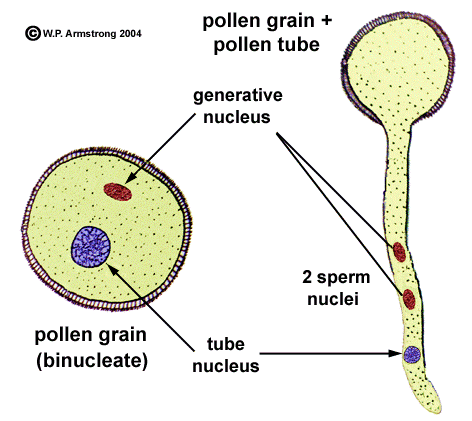 Complete Answer:-A binucleate angiosperm dust grain containing a generative core and a cylinder core. After the dust grain develops into a dust tube, the generative core isolates into two sperm cores. Since the generative core and sperm cores contain cytoplasmic sheaths, they are regularly alluded to as cells in certain course books. The cylinder core controls the development of the dust tube as it becomes down the style and into the ovary of a blossom. In the end, it infiltrates the micropyle of an ovule and deliveries its two sperm into the 8-nucleate undeveloped organism sac. During twofold preparation, one sperm wires with the egg core to frame a zygote. The other sperm wires with the two polar cores inside the endosperm mother cell to shape the endosperm. In corn, this cycle must happen for each grain that structures. Much additionally astounding is the development of discrete dust tubes down each strand of silk (styles).