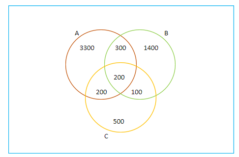 Note: In this question, you may get confused in conversion of percentages into number of families and then in sketching the Venn diagram. You can also solve this question by using the formula: the number of families that buy only newspaper A = $n(A) - n(A \cap B) - n(A \cap C) + n(A \cap B \cap C)$ = $4000 - 500 - 400 + 200 = 3300$.