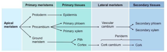 The secondary tissues of plants arise from lateral meristems, and it is mainly responsible for increasing diameter and girth of stems and roots (secondary growth). The tissue responsible for secondary growth consists of two lateral meristems: Vascular cambium and cork cambium. The vascular cambium adds a layer of vascular tissue called secondary xylem and secondary phloem. The cork cambium replaces the epidermis with periderm, which is tough and thick.