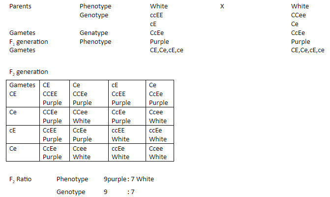 Example: when white flowered sweet peas are crossed they produce plants with purple flower F1 plants on inbreeding or self-fertilization give F2 generation in a ratio of purple flowered to 7 white flowered plants.