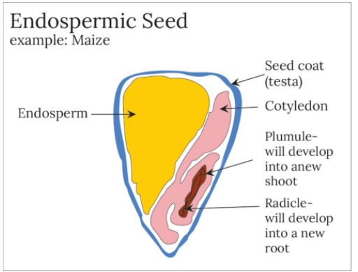 E.g. Dicot endospermic seeds are Poppy, Custard apple, Muskmelon, Fenugreek, and Monocot endospermic seeds are Cereals, Millets, Palm, Onion, etc.