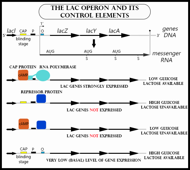 The lac operon constitutes an operator, promoter, and other structural genes that are necessary for proper functioning and are controlled by the repressor. The lac operon contains genes that codes for a protein that is needed to obtain and process the lactose from the surrounding. These codes are of various types, coding different proteins such as I, P, O, lac Z, lac Y, and lac A. Of this, the lac I gene codes for a repressor protein that controls everything.