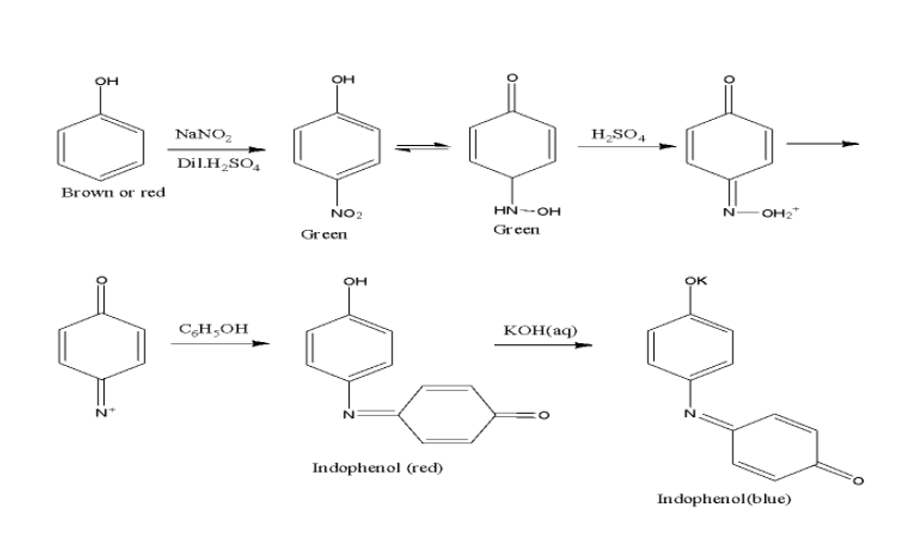 - When phenol is treated with sodium nitrate $(NaN{{O}_{2}})$ and concentrated sulphuric acid $({{H}_{2}}S{{O}_{4}})$, the product formed will have deep green or blue colour which when diluted with water, it changes to red.