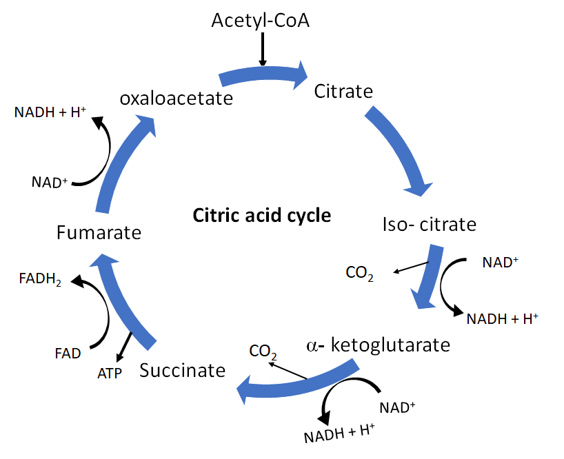 Krebs’ cycle is the central pathway for the metabolism of carbohydrates, fats, and proteins. It begins with a citric acid molecule which is a 6- carbon compound and ends at Oxaloacetate which is a 4-carbon compound which indicates the removal of two carboxyl groups.