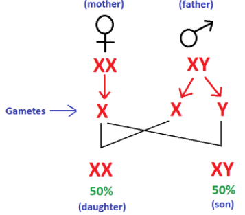 Hint: The gender of an individual is decided by the genes the offspring inherits from the parents. The father can donate either a Y chromosome or a X chromosome. The mother can only donate an X chromosome. If the offspring receives two X chromosomes, they're going to be female. If the offspring inherits an X and a Y chromosome, they're going to be male.