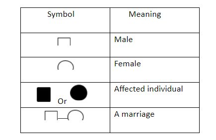 Note: In pedigree analysis, each row indicates a generation. The individual who brought the family to the attention of the pedigree analyst or researcher is called a ‘proband’. The proband can be identified by an arrow pointing towards the individual (the symbol which shows him/her).
