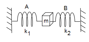 Let the block m be displaced by x towards the right then spring A will pull the block by force \[{k_1}x\] and compression force acting on spring B will be \[{k_2}x\] as shown in the image below,