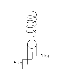 The two masses which hang on the smooth pulley and the smooth pulley is suspended on the spring, the two masses are $1\,kg$ and $5\,kg$.