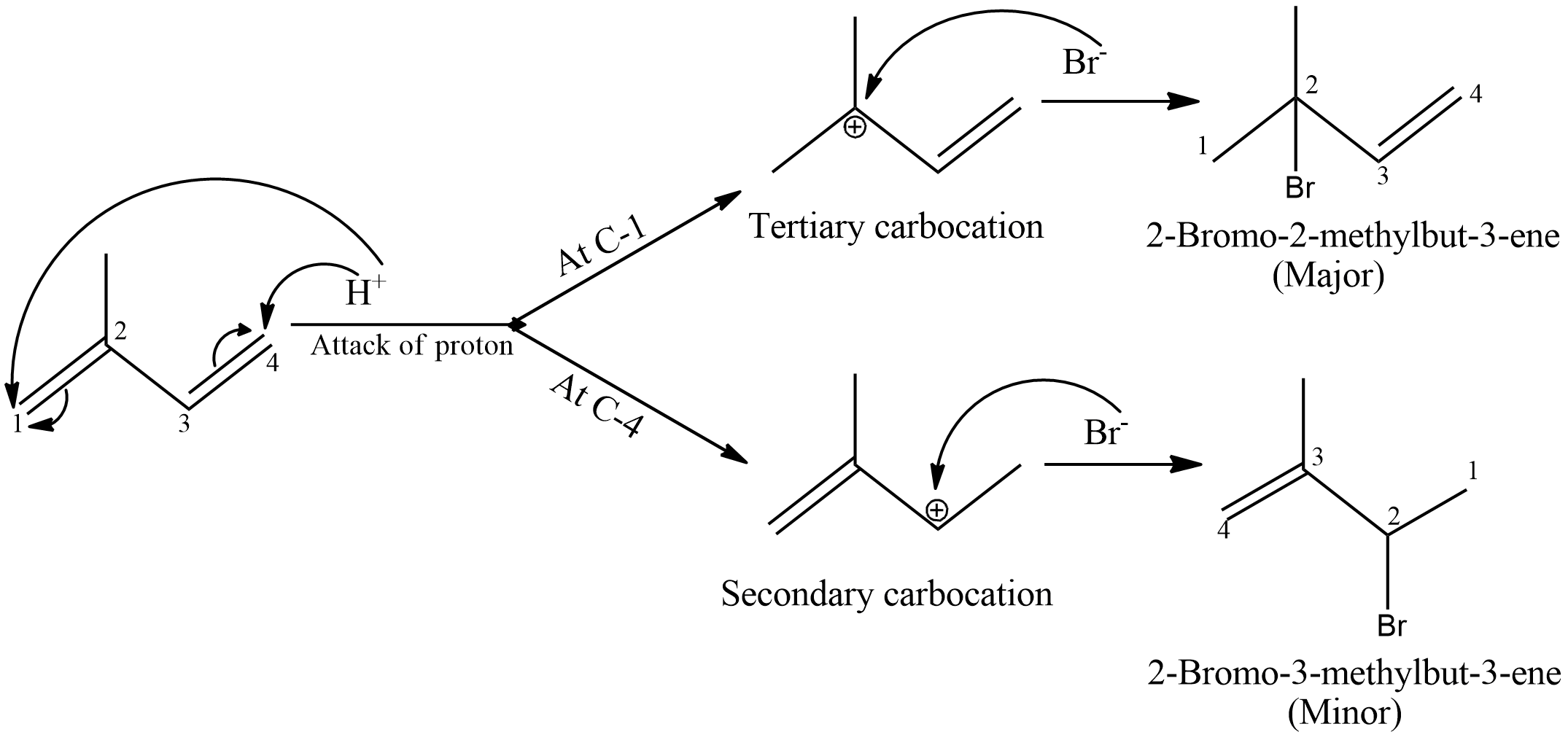 - Proton attack will happen only on C-1 and C-4 because of Markovnikoff’s rule.