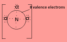 In ${\text{NC}}{{\text{l}}_3}$nitrogen has three valence electrons and one lone pair electron and each chlorine contributes one valence electrons to form covalent bond so the central atom is surrounded by $8$ valence electrons. The Lewis structure is-