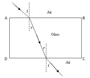 $\eta =\dfrac{\operatorname{Sin}i}{\operatorname{Sin}r}$ where i is the angle of incidence and r is the angle of refraction. Refractive index for glass is greater than one. Hence from this we can imply that angle of incidence is greater than the angle of refraction i.e. light bends as it moves from air to glass. One more key point to be kept in mind is that the frequency of light does not change when a monochromatic light enters from a rarer to denser medium, but its wavelength does.
