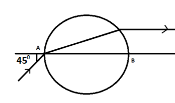 Light ray is incident at an angle 45° on glass sphere. The light ray emerges out parallel to diameter AB as shown. The value of the refractive index of the material is?