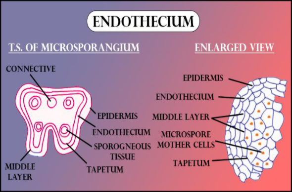 Note: The microspore or the male gametophyte formed will have several layers: Epidermis (outer single layer, degenerates at maturity), endothecium (single layer below the epidermis, have fibrous thickening), many middle layers (cells degenerates in the mature anther), and tapetum (single layer having dense cytoplasm and provide nutrition to the developing microspore).