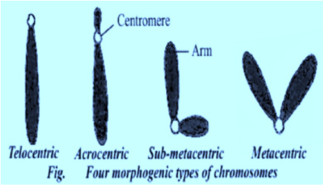 Telocentric: The centromere is present at the extreme end. That is the centromere is present in the telomeric region. Hence the name telocentric. However, these telocentric chromosomes are not found in humans. These chromosomes appear in the shape of the alphabet ‘i’ during metaphase.