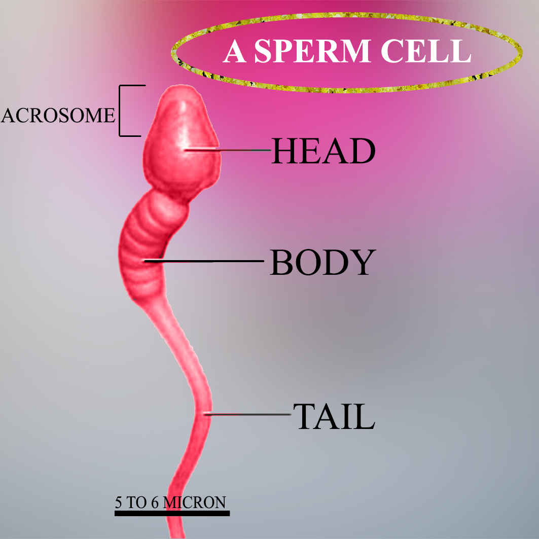 A typical structure of sperms is composed of a head, neck, middle piece, and a tail. The sperm head contains the genetic material represented by an elongated haploid nucleus. Its anterior portion is covered by a cap-like structure known as acrosome. The penetration of sperm into the egg is because of the presence of acrosome in the head. It contains digestive enzymes like hyaluronidase and acrosin which helps in the dissolution of the plasma membrane of the egg cell. Its penetration into the ovum brings about fertilization. The middle piece or midpiece contains mitochondria arranged spirally. It provides the energy or ATP for locomotion of sperm to the site of fertilization and sperm metabolism.