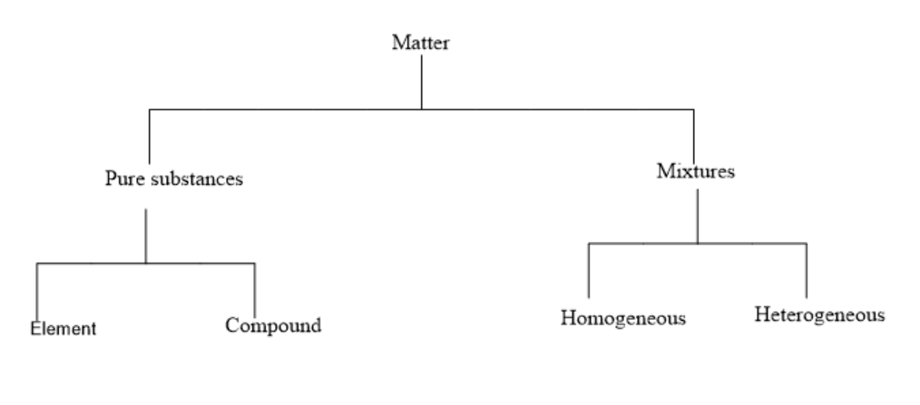 As shown in the diagram above, we can see that macroscopic matter is broadly classified into two main categories: Pure substances and mixtures. The pure substances are sub-categorized into Element and compound and mixtures are sub-categorized into Homogeneous and Heterogeneous.