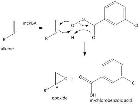 \[mcPBA\] is known as meta-chloro perbenzoic acid or meta-chloroperoxybenzoic acid. It contains a peroxide linkage. It is a stable peracid and the oxygen attached to the carboxylic group is electron deficient oxygen or electrophilic. It attacks the electron rich alkene and the reaction proceeds through a concerted transition state.