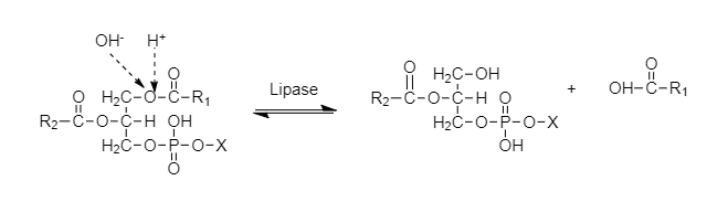 The hydrolysis reaction of lecithin with lipase enzyme in aqueous solutions. Hydrolysis of lecithin saturated or unsaturated acyl are present as residue.