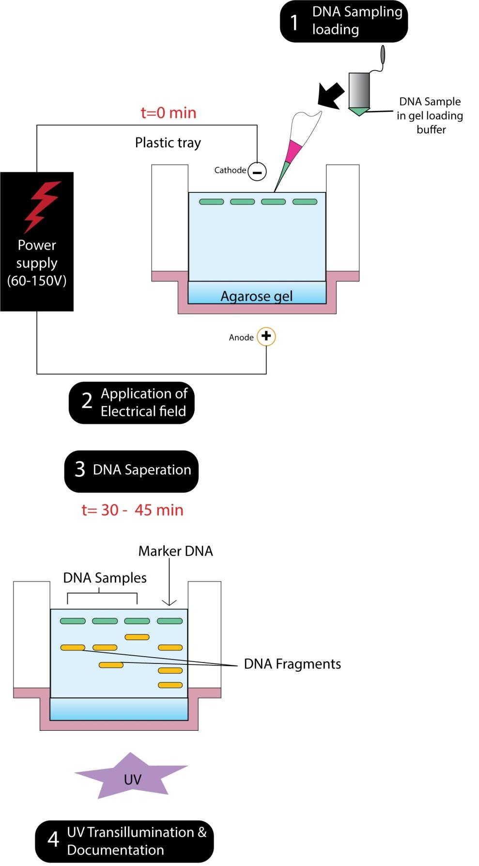 By the combination of DNA from two or more sources, recombinant DNA (or rDNA) is done, which often involves combining the DNA of different organisms. This process of gel electrophoresis depends on the ability to cut and rejoin DNA molecules at points that are identified by specific sequences of nucleotide bases called restriction sites. Here, DNA fragments are cut out of their normal position in the chromosome using restriction enzymes (also called restriction endonucleases) and then inserted into other chromosomes or DNA molecules using enzymes called ligases. The gene and the plasmid are extracted from the cells in rDNA technology. By using the agarose gel electrophoresis technique the DNA fragments can be separated. A technique used to separate DNA fragments according to their size is called gel electrophoresis where DNA samples are loaded into wells (indentations) at one end of a gel, then to pull them an electric current is applied through the gel. As we know, DNA fragments are negatively charged, so they move towards the positive electrode. As a result, separation of the DNA fragments based on their size when there is an external supply of electric charge.