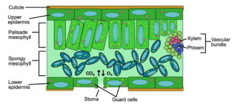 Hint: The internal cell membrane situated seen between leaf's two epidermal cell layers is mesophyll. Two kinds of tissues are composed of the palisade parenchyma, an upper layer of elongated chlorenchyma cells containing large amounts of chloroplasts. It also has spongy parenchyma, a lower layer with few chloroplasts and spherical or ovoid cells with very visible intercellular air spaces.