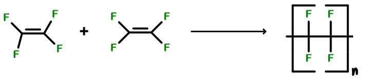 -Here, we can see the structure of teflon which is made up of so many molecules of tetrafluoroethylene by the polymerisation reaction.