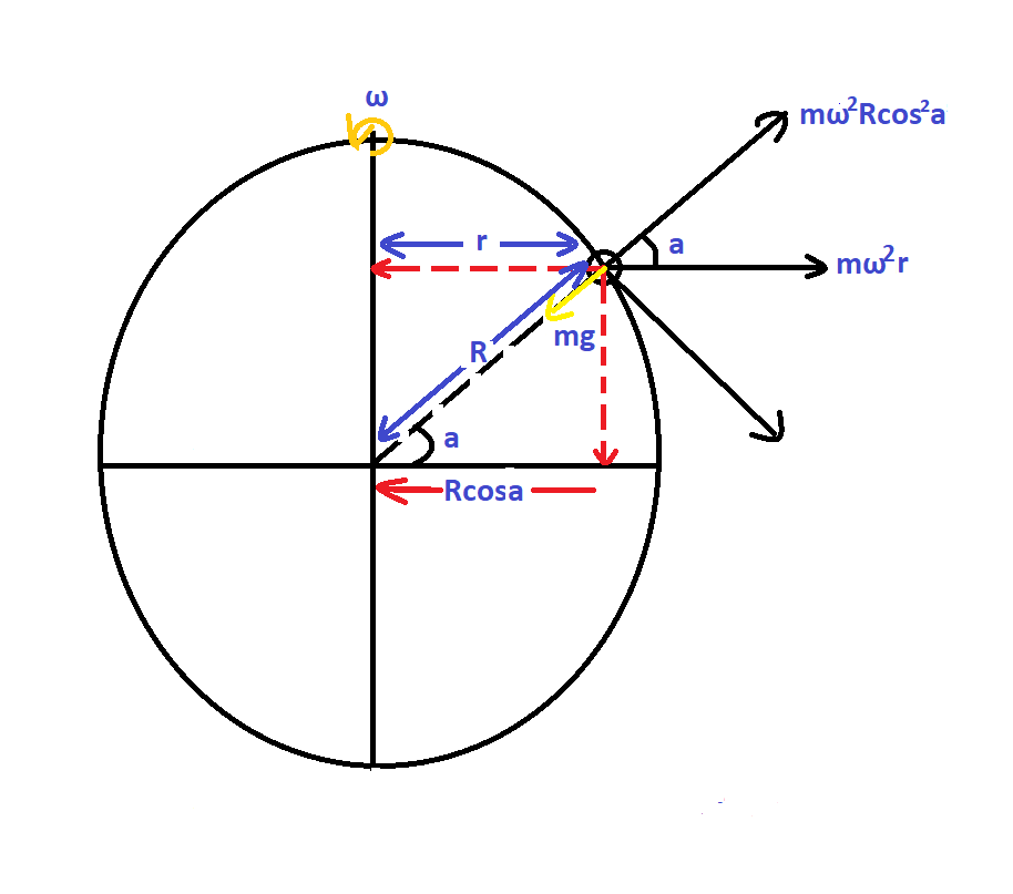 To know the angular velocity with which earth should rotate, we must first have to evaluate the relation between angular velocity and gravitational force based on degree of latitude. Imagine this as earth surrounding and pulling a small particle at degree a above equator,