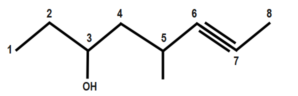 Always remember that if there is an alcohol present in a molecule, then number the longest chain by starting at the end closest to alcohol and follow similar rules. However, take care that the suffix in this case would be –ynol, as the alcohol group has more priority than the triple bond.
