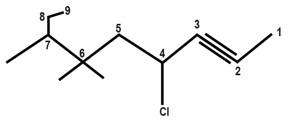 Next step after numbering the longest chain with the least number assigned to the alkynes, we have to label each substituent at its corresponding carbon.