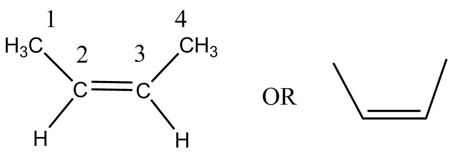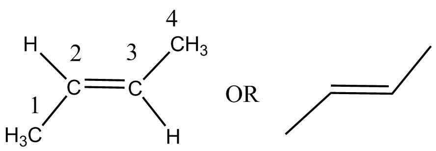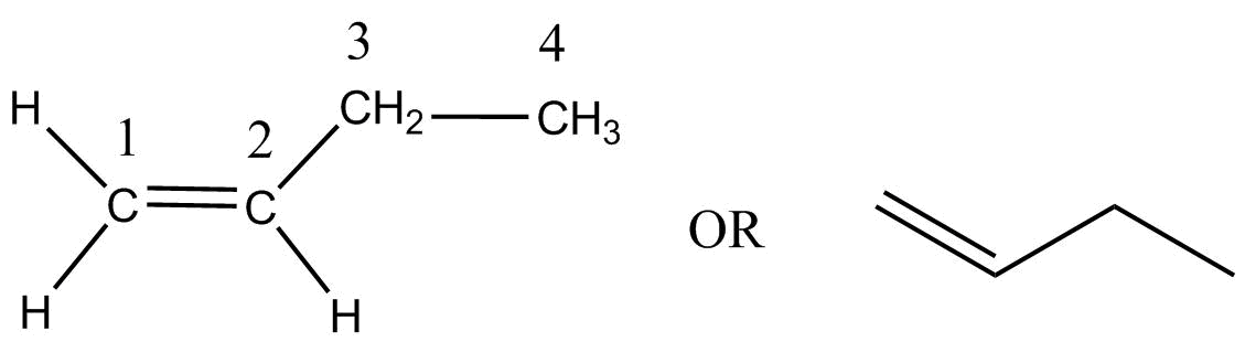 (1) The chemical formula for butane is: ${C_4}{H_8}$ which means it is made up of four carbon atoms and eight hydrogen atoms. The $ene$ part of the name refers to an alkene. So we know that butane’s structure must include a carbon double bond.
