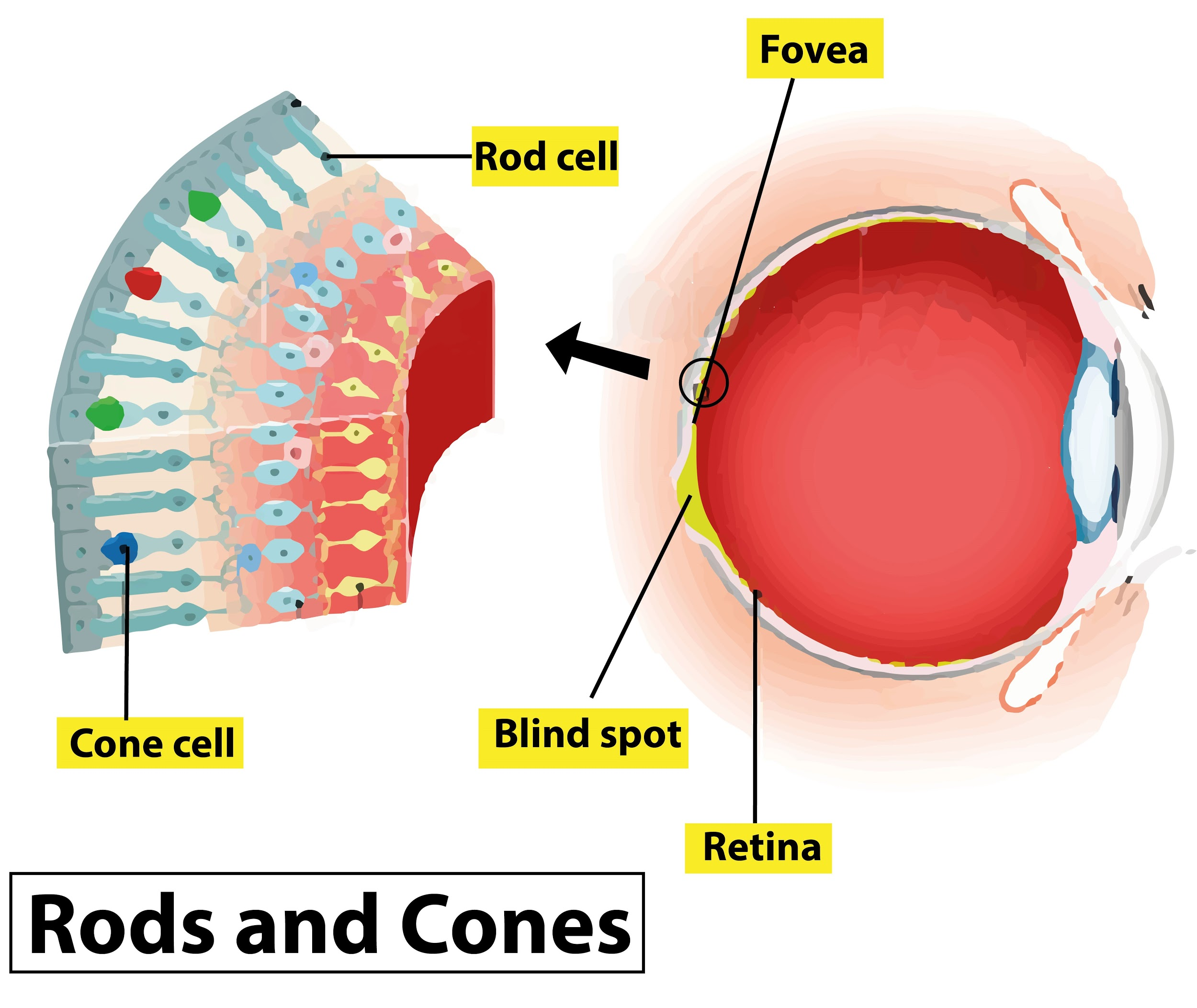 The photoreceptor cells are present in the retina of the eyes. These cells are capable of absorbing light and convert these signals to trigger the change in the membrane potential. Rods are one of the types of cells which are sensitive to the dim light conditions. Hence, making them responsible for the low light vision. They are present at the peripheral portion of the retina. They are cylindrical in shape and are comparatively longer and narrower than the cone cells. They are extremely sensitive to the low lights. In the human eye, they are present in the average number of 120million cells. They can be easily triggered by a single photon of light. They also help in scotopic vision which is low light vision. They have a faster regenerative power than the cone cells. Rod cells contain a pigment known as rhodopsin. They are also sensitive to scattered and direct light. The visual acuity of rod cells is less than the cone cells. They are absent in the fovea. And their loss can lead to night blindness in humans.