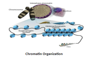 Chromatin is a complex of RNA, DNA and protein. The main function is in packaging of long DNA molecules into denser shape, compact which stops the strands from becoming tangled and play a crucial role in strengthening the DNA during cell division. In mitosis and meiosis chromatin is useful in separation of the chromosomes in anaphase, the typical shapes of chromosomes visible during this stage is the result of DNA being looped into a highly condensed system of chromatin. The main protein constituents of chromatin are histones, which is attached to the DNA and acts as an anchors around where components are wound. Chromatin inside a cell may be condensed to varying degrees depending on the cell's stage in the cell cycle. In nucleus chromatin occurs as euchromatin and heterochromatin. Most of the chromatin is in less compressed form called euchromatin where most of the DNA is visible permitting replication and DNA transcription to occur. In transcription the DNA double helix unwinds and opens to allow the genes coding for the protein to be replicated. DNA replication and transcription are essential for the cell in making DNA, proteins and organelles for cell division. Euchromatin is involved in the active transcription of DNA into Mrna. It is more open which allows the recruitment of RNA polymerase complexes and regulatory proteins so transcription is initiated. Euchromatin is in transcriptionally functional cells because it contains DNA, which helps in folding heterochromatin which helps in the transcription by inhibiting the access of RNA polymerase and other regulatory proteins to the DNA.
