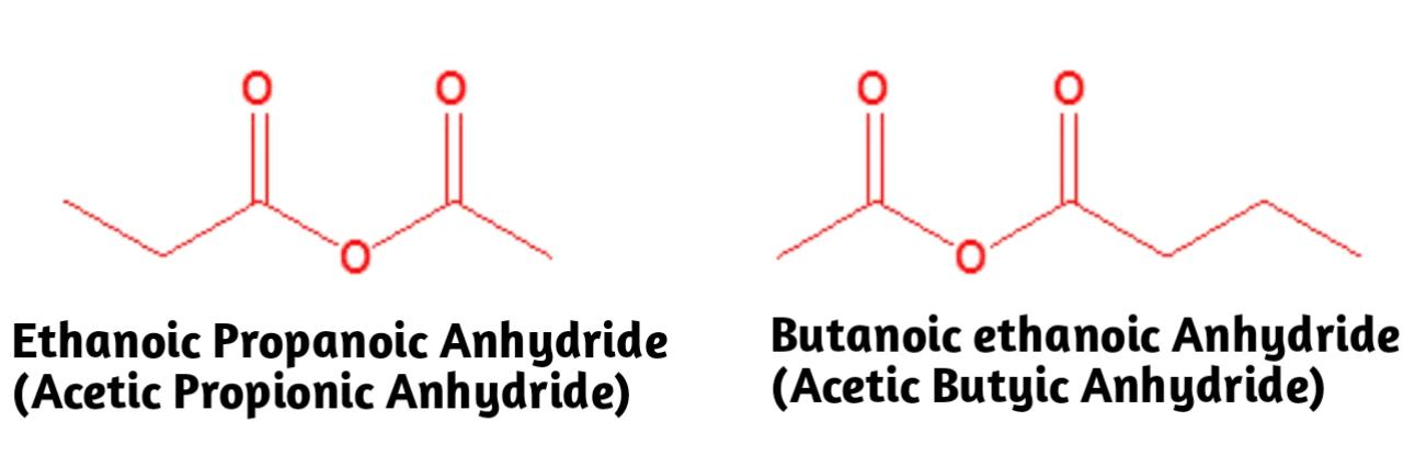 We have named unsymmetrical acid anhydrides by naming each component carboxylic acid alphabetically without the word acid, followed by spaces and then the word anhydride.