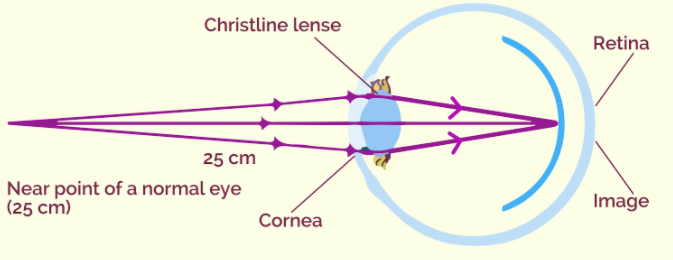 The human eye can see objects clearly without any strain on the eye when an object is placed at least 25 cm away. This distance of 25 cm is known as the near point of the eye. When the object is placed at a distance between 25 cm and infinity, the image of the object is formed on the retina and interpreted clearly. If an object is placed closer than 25 cm, an image is formed behind the retina and hence strains the eye and is not clear.