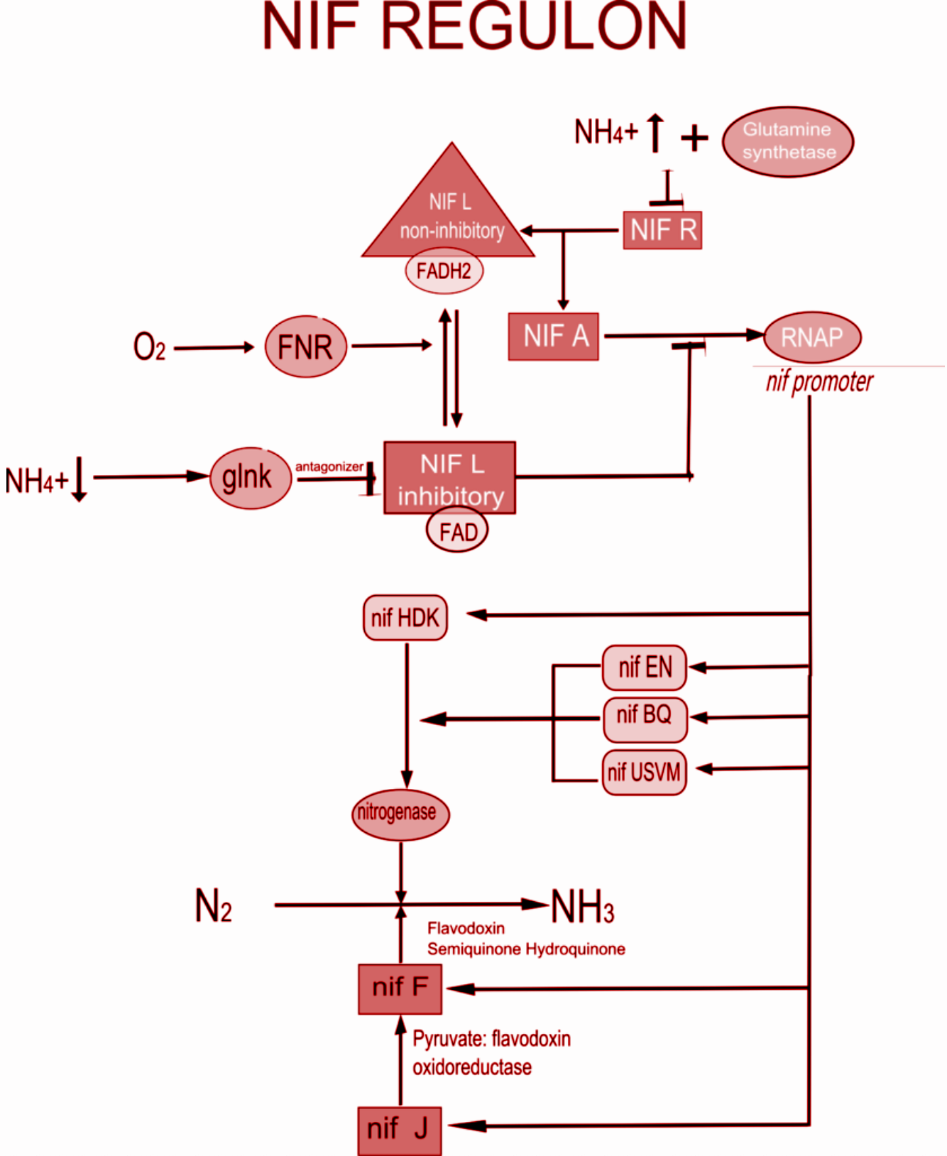 - The expression of ‘Nif’ genes is induced as a response to low concentrations of fixed nitrogen and oxygen (the low oxygen concentrations are actively maintained in the root environment of host plants).