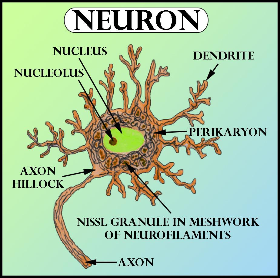 The cell body of the neuron is round, oval, pyramidal and star-shaped. It consists of cytoplasm with cell organelles and some granular bodies called Nissl's granules and fibres containing neurofibrils. The Nissl granules are made up of rough endoplasmic reticulum and with the attachment with ribosomes, it synthesises protein. It also helps in the transmission of the impulse. In dendrites, Nissl's granules and neuro-fibrils both are present and it conducts nerve impulse toward the cell body, by afferent process. Axon is a long fibre, whose distal end is branched and terminates out in form of the synaptic knob which possesses synaptic vesicles containing neurotransmitters. The nerve impulse passes from one neuron to the next neuron with help of the neurotransmitter acetylcholine. The conduction of nerve impulse in the axon takes place by the efferent process which means from the cell body to axon.