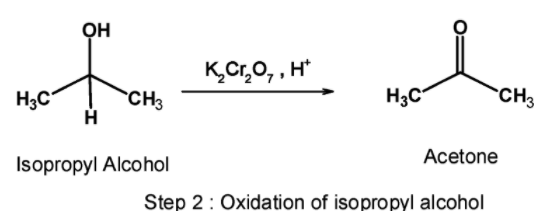 In the second step, the isopropyl alcohol obtained is oxidized using a suitable oxidizing agent. Here, acidified potassium dichromate is used to convert the isopropyl alcohol to acetone. The reaction is as shown below,