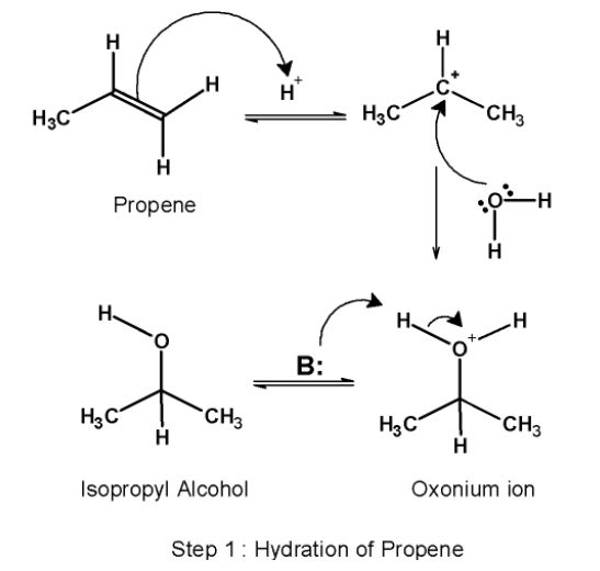 The first step involves the acid-catalyzed hydration of the alkene i.e.propene.it converts the alkene into corresponding alcohol. Here, propene on hydration forms isopropyl alcohol. This step itself comprises three sub-steps. Those are as follows: