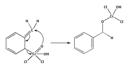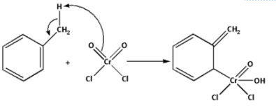 Step 1: The hydrogen from the methyl group of toluene is abstracted by the chromyl chloride. The chromyl chloride forms a bond with the benzene ring. This complex is known as Etard’s complex.