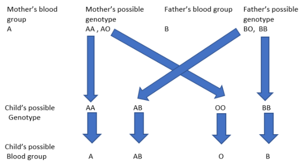 If the mother have the blood group $A$ and the father have the blood group $B$ or is the father have the blood of the type $A$ and the mother with the type $B$, then the child born to them will have either $A$ or $B$ or $AB$. Since $O$ is the common universal blood group, the child can also have this blood group. Hence all the given options are correct.