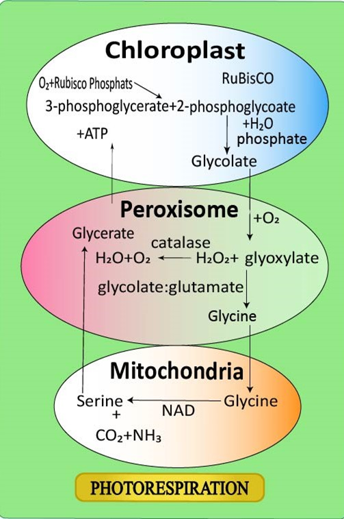 Hint: Photorespiration is a process in plant metabolism where enzyme RuBisCO oxygenates RuBP. This reaction takes place in three organelles of plants. It is a wasteful process that occurs in ${ C }_{ 3 }$ plants that inhibit the rate of photosynthesis in the existence of high oxygen concentration in light.