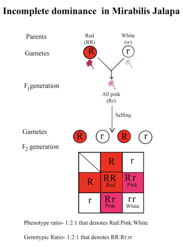 The red flower-bearing plant (RR) and the white flower-bearing plant (rr) when cross-pollinated give rise to a pink flower-bearing plant with the phenotype (Rr). It occurs because the dominant allele couldn't completely mask the effect of the recessive allele and the progeny showed a blending of both alleles. This phenomenon is known as incomplete dominance.