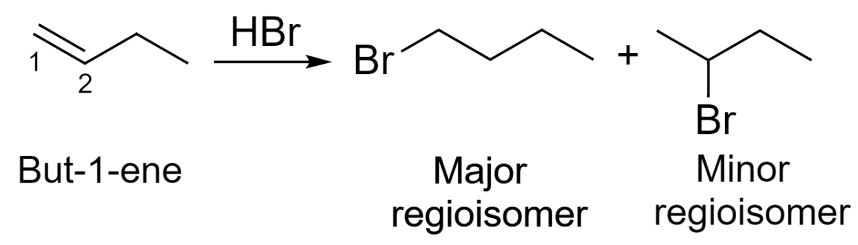 Markovnikov additions are common examples of regioselective reactions. In addition to HBr to but-1-ene, we would see a preference for the formation of a secondary carbocation over primary carbocation, though it would seem either orientation is possible.