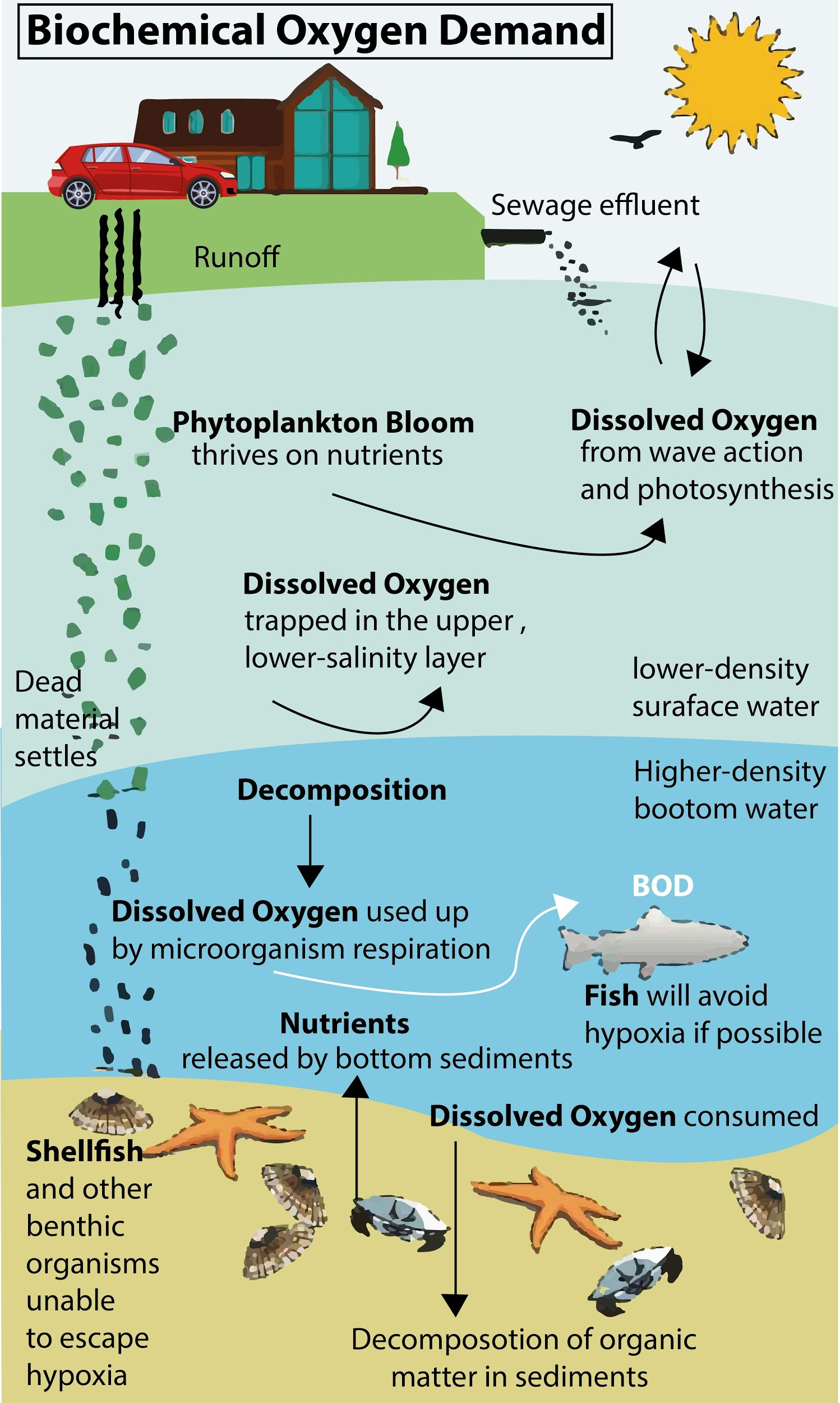 Note: Sewage water with its high concentration of organic matter increases the BOD of the water body significantly. This is due to the requirement of more aerobic bacteria to decompose the organic matter. The abnormal increase of aerobic microbial activity causes a shortage of dissolved oxygen for other aquatic species like fishes and they ultimately die.
