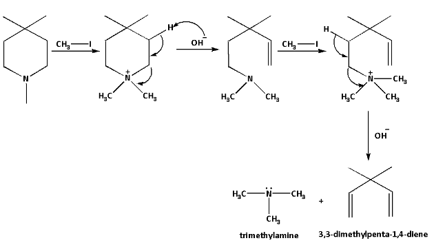 We are given a quaternary ammonium salt which is known as 1,4,4-tetramethylpiperidine. The 1,4,4-trimethyl pyridine reacts with methyl iodide and forms ammonium iodide salt. The iodide anion is then substituted by hydroxide anion which is formed by the deprotonation of water molecules. Then the reaction mixture is heated to start the elimination reaction.