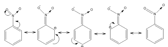 In the above example, the nitro group is pulling electron density from the benzene ring and showing a negative resonance effect.