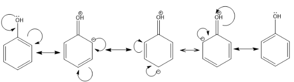 In the above example, the hydroxyl group is donating its lone pair of electrons to the benzene ring and pi bond delocalization is taking place.