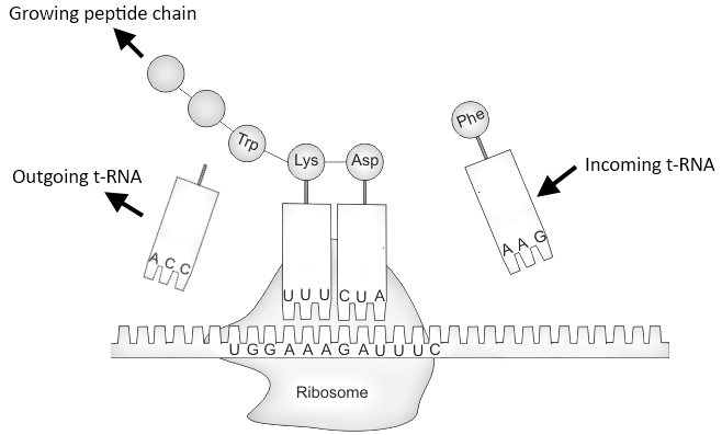 During translation, ribosomal subunits assemble a sort of a sandwich on the strand of mRNA, where they proceed to draw in tRNA molecules tethered to amino acids (circles). an extended chain of amino acids emerges because the ribosome decodes the mRNA sequence into a polypeptide or a replacement protein.