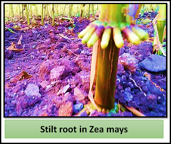 Stilt roots help to support the body of the plant, just like tent ropes. They are also called as support roots. Also, mechanical support is intended. The scientific name is Zea mays for maize and Red mangrove is Rhizophora mangle.