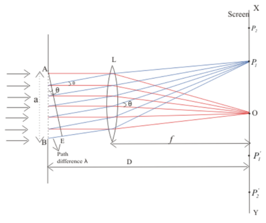 Let us assume that a parallel beam of light incident on a slit AB of width ‘a’ which is of order f the wavelength of light as shown in the figure. A real image of diffraction pattern is formed on the screen with the help of converging lenses placed in the path of the diffracted beam. All the rays which start from the slit AB in the same phase and produce brightness at point O on the axis of slit as they arrive in the same phase. Thus, the diffraction pattern on screen consists of a central bright band and alternate dark and bright bands of decreasing intensity on both sides.